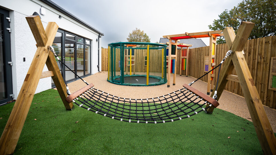 Outdoor play area with rope hammock and covered structure.