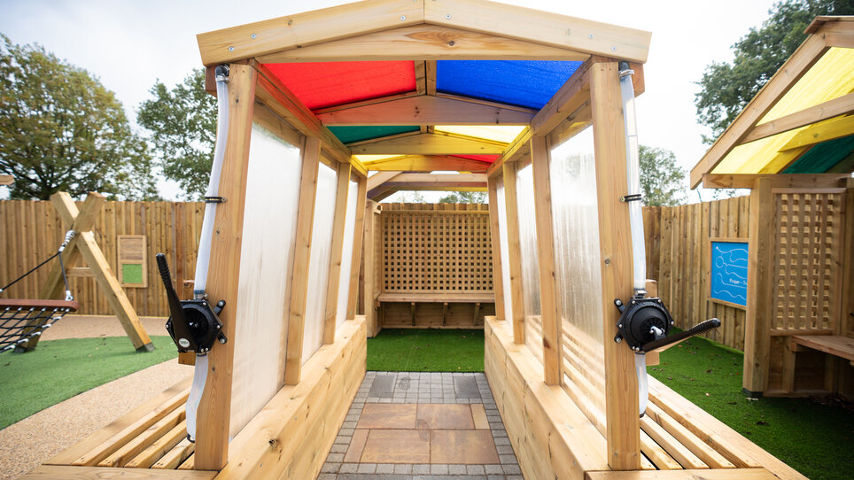 Sensory wooden walkway with colourful roof panels.
