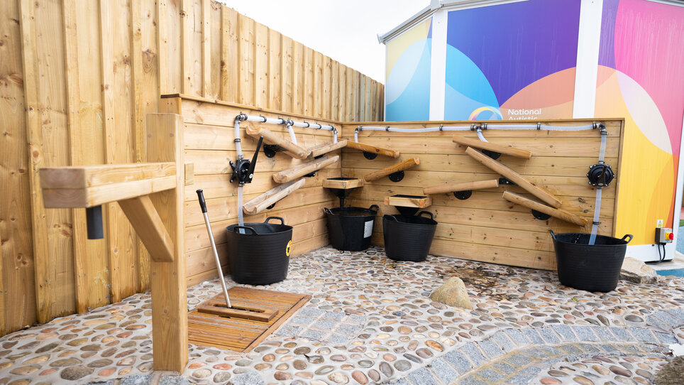 Interactive wooden water play station with manual pumps.